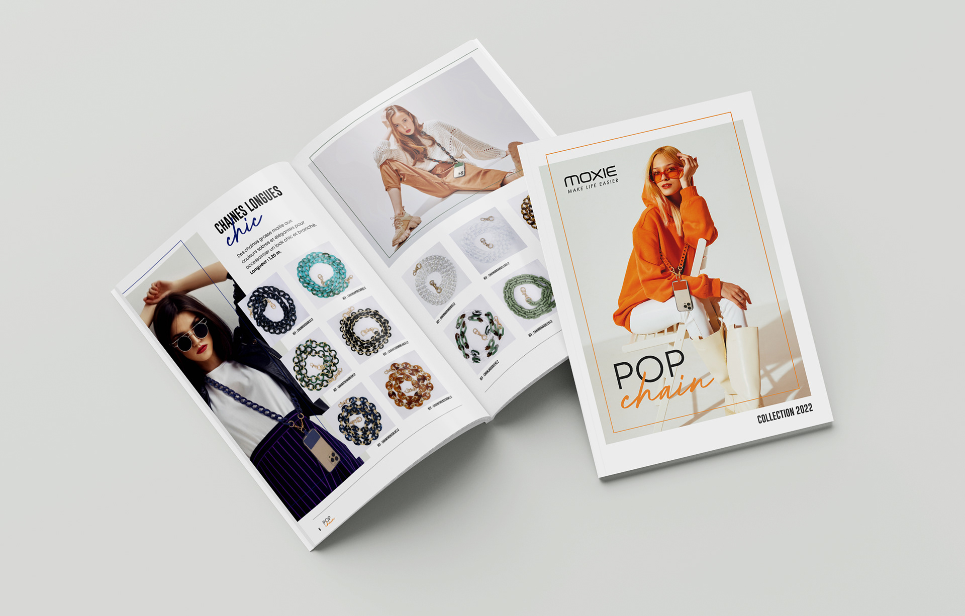 Direction artistique et mise en page du catalogue d’accessoires de téléphones portables Moxie.