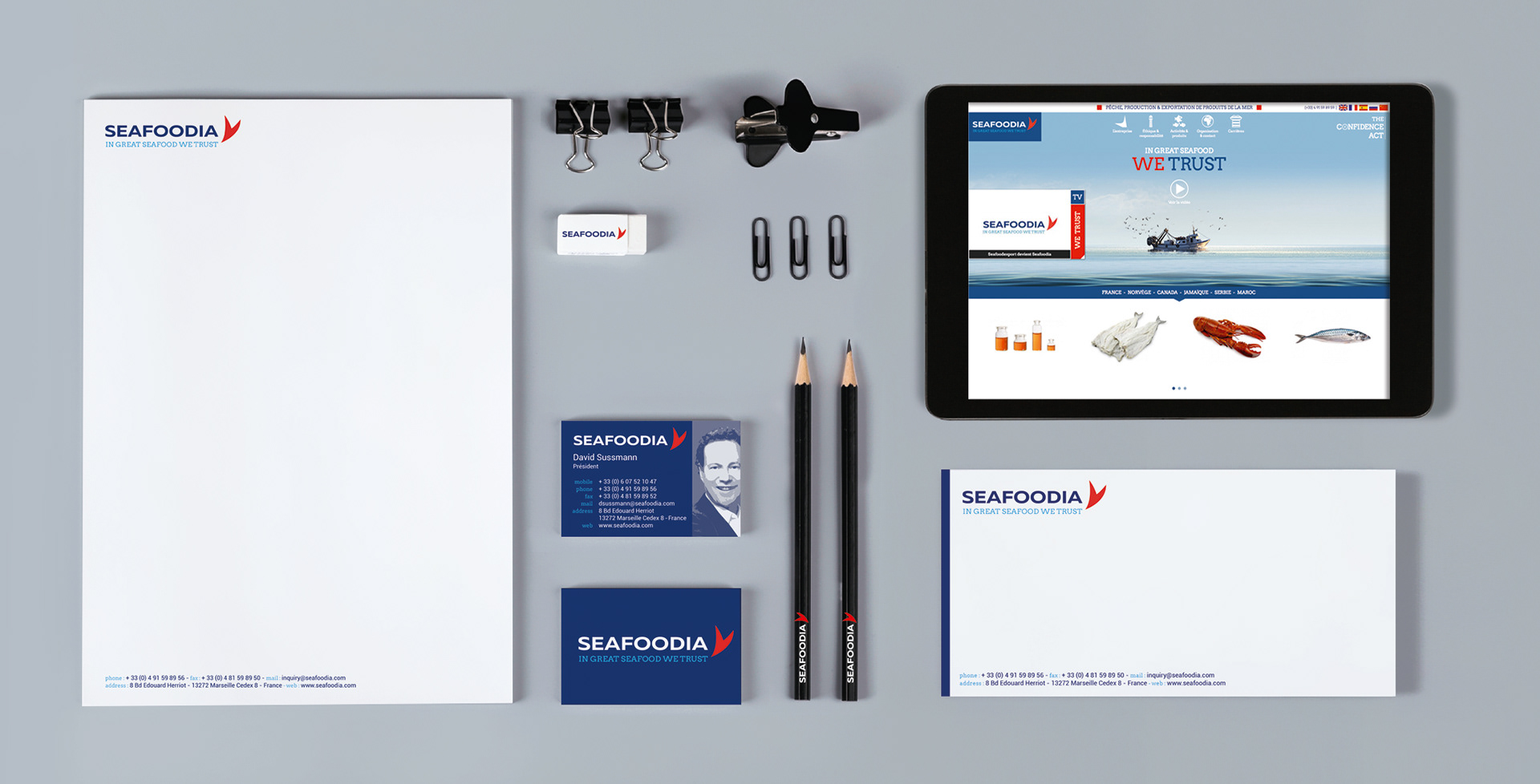 Direction artistique du logo et de la charte de Seafoodia, société marseillaise spécialisée dans la pêche, la production et la commercialisation des produits de la mer à l'échelle internationale.